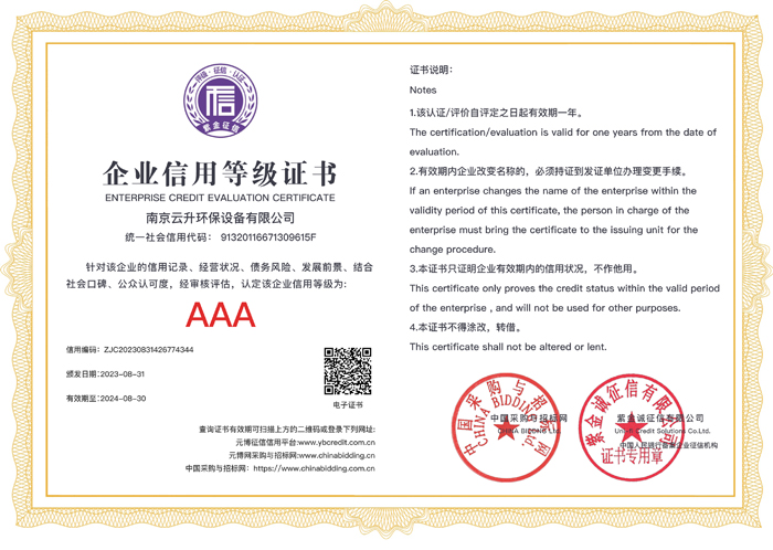 南京云升環保設備有限公司全體員工愿以環境保護為己任,以市場為導向,以優質服務為原則,嚴格的管理、先進的生產工藝、至上的品質、完善的售前售后服務,與廣大新老用戶攜手并進,共鑄輝煌。公司已通過ISO9001:2000質量管理體系標準認證,成為江蘇省高新企業,并進行不斷的技術改進和創新,為客戶和合作伙伴提供滿意的產品。
